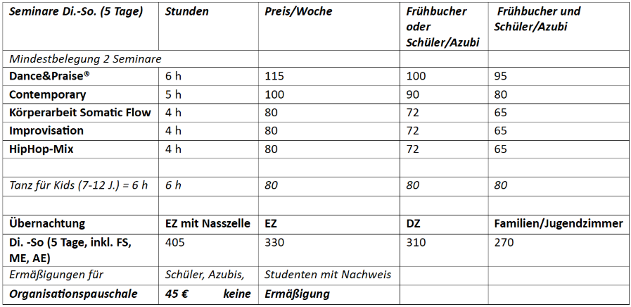 Kursangebot & Preise Sommertanzwoche 2026